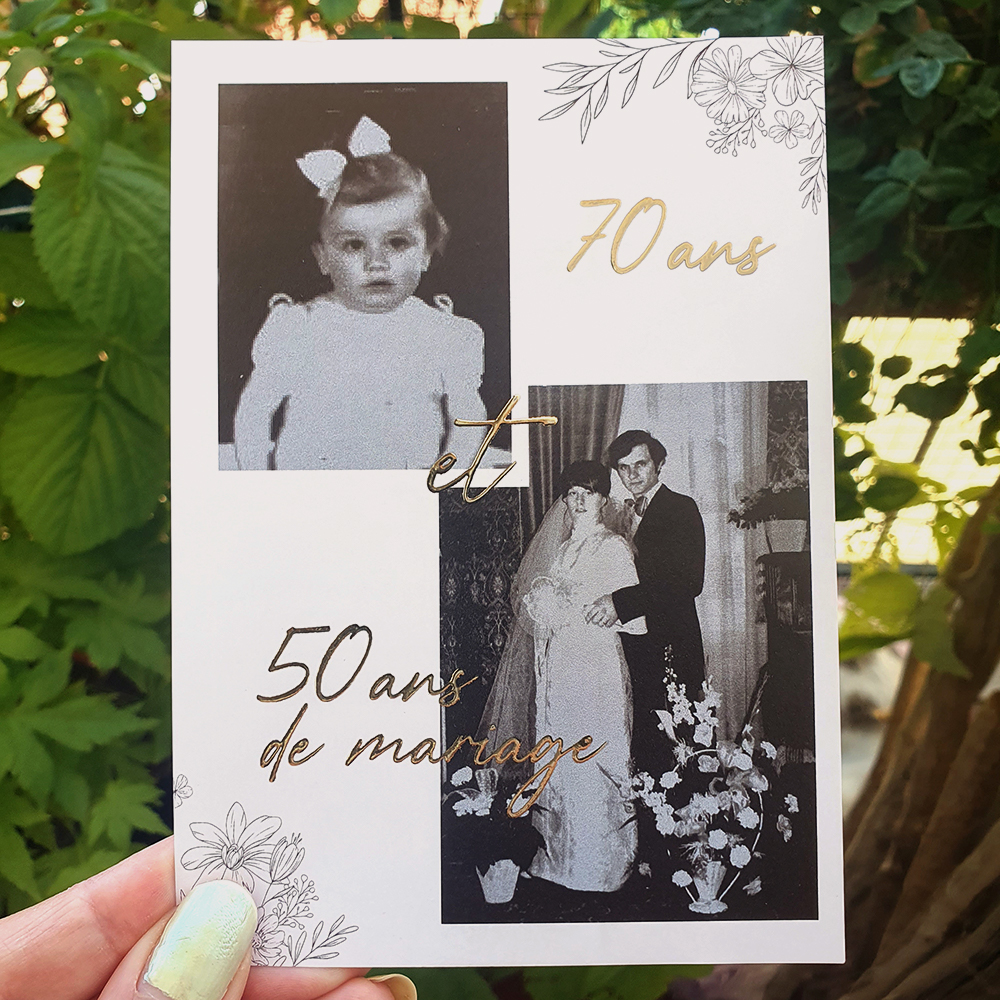 Format : A6, Papier 250gr brillant avec dorure à chaud